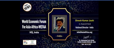 Lucknow, India, The World Economic Forum For Asia-Africa (WeFaa) has issued a press release and announced that “Dinesh Kumar Joshi” Chairman of Global Trade Promotion Organization from INDIA is appointed “National Director For INDIA of the World Economic Forum For Asia-Africa (WeFaa)” by Global President – WeFaa Dr. Mohammad Seraj ANSARI.